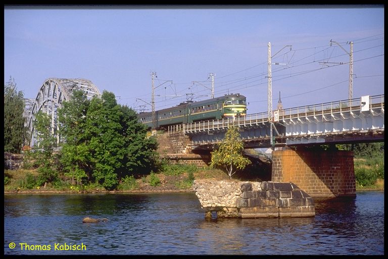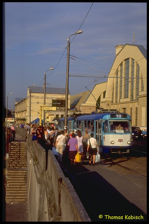 Straßenbahn gucken: Tatras mit Stangenstromabnehmer, Eisenbahnbrücke über