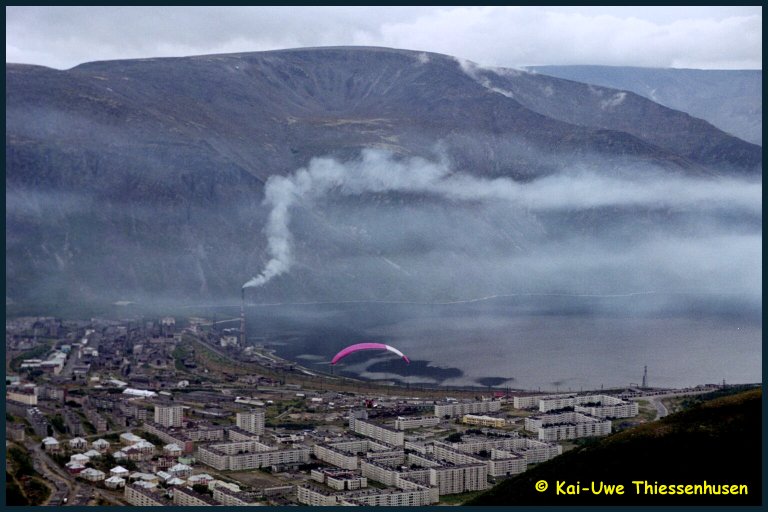 Und Abflug, der Gleitschirm segelt auf Kirowsk zu.