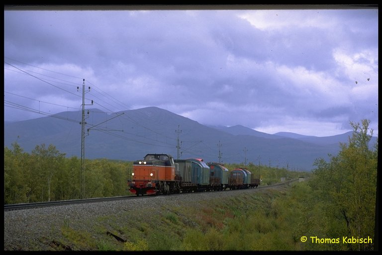 T44 mit mystischer Fracht. Weniger Kilometer vor Abisko.